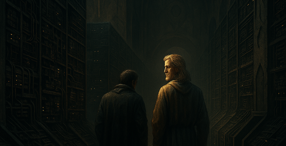 Dentro, las bóvedas no contenían tesoros ni manuscritos, sino hileras interminables de servidores y consolas. Máquinas interconectadas, mantenidas por los drones silenciosos. Sobre la entrada, grabado en letras doradas: MITHRA OS.
